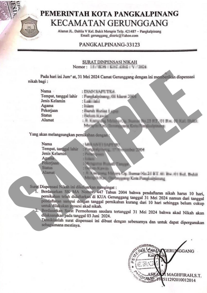 4. Peraturan Menteri Agama RI Nomor 19 Tahun 2018 Pasal 7 Ayat 4 tentang jika Pelaksanaan Akad Nikah kurang dari 10 hari kerja sejak pendaftaran perkawinan, pelaksanaan perkawinan dilakukan setelah mendapat surat Dispensasi dari Camat setempat.